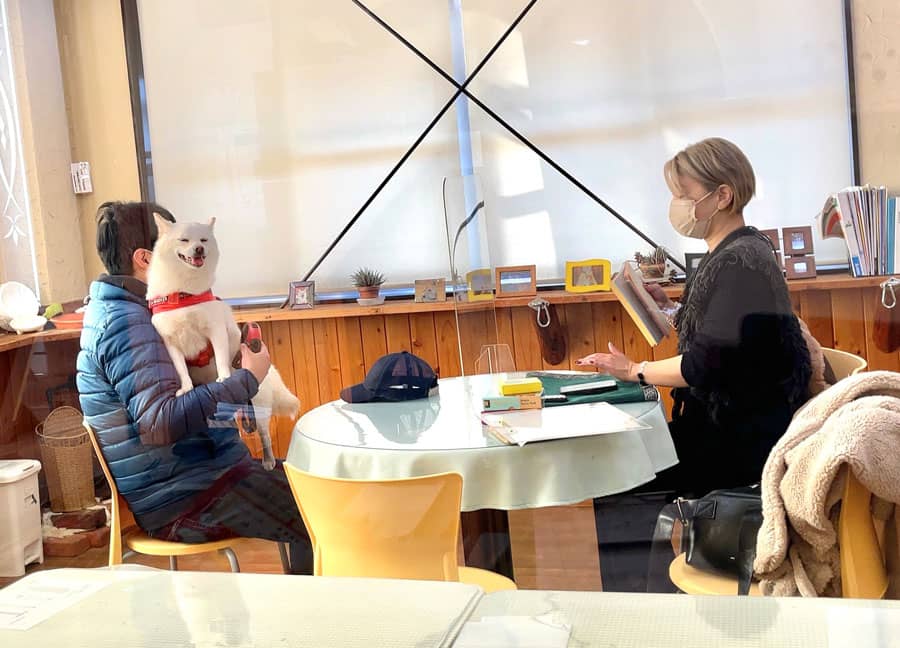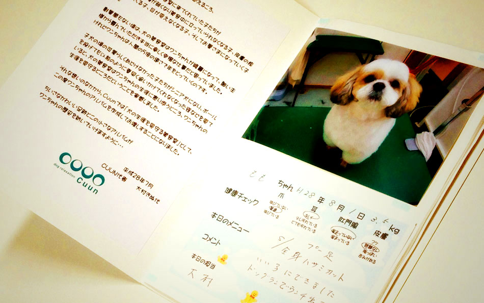 トリミング後にフォトスタジオで写真を撮影し、健康チェックやトリミングメニューのカードと合わせたアルバムをお渡ししています。