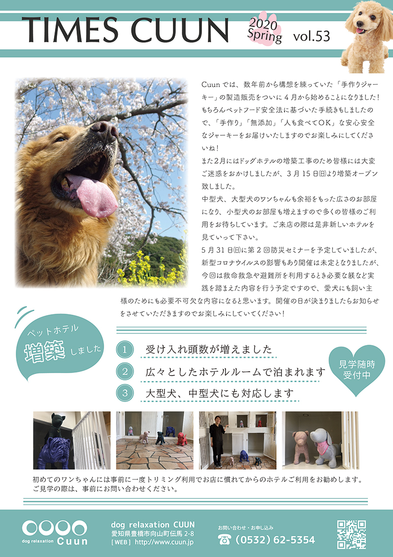 ワンちゃんの健康と安全性を最優先したチキンジャーキー、「Cuunオリジナルチキンジャーキー」新発売です。ワンちゃんに大好評の奥三河どりを使用しています。ぜひ、ご賞味下さい! 【商品ラインナップ】・20g¥550円(税込)・50g¥880円(税込)・... -